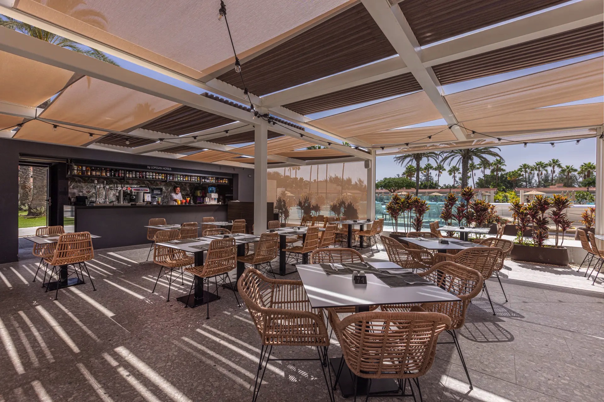 Edle Materialien in einer Atmosphäre, die die Schönheit der Umgebung hervorruft und überträgt, ein natürliches und einzigartiges Ambiente, das die Idylle eines Urlaubs in Maspalomas widerspiegelt. Hier scheinen die Tage länger, die Momente intensiver und die Zeit kostbarer zu sein.